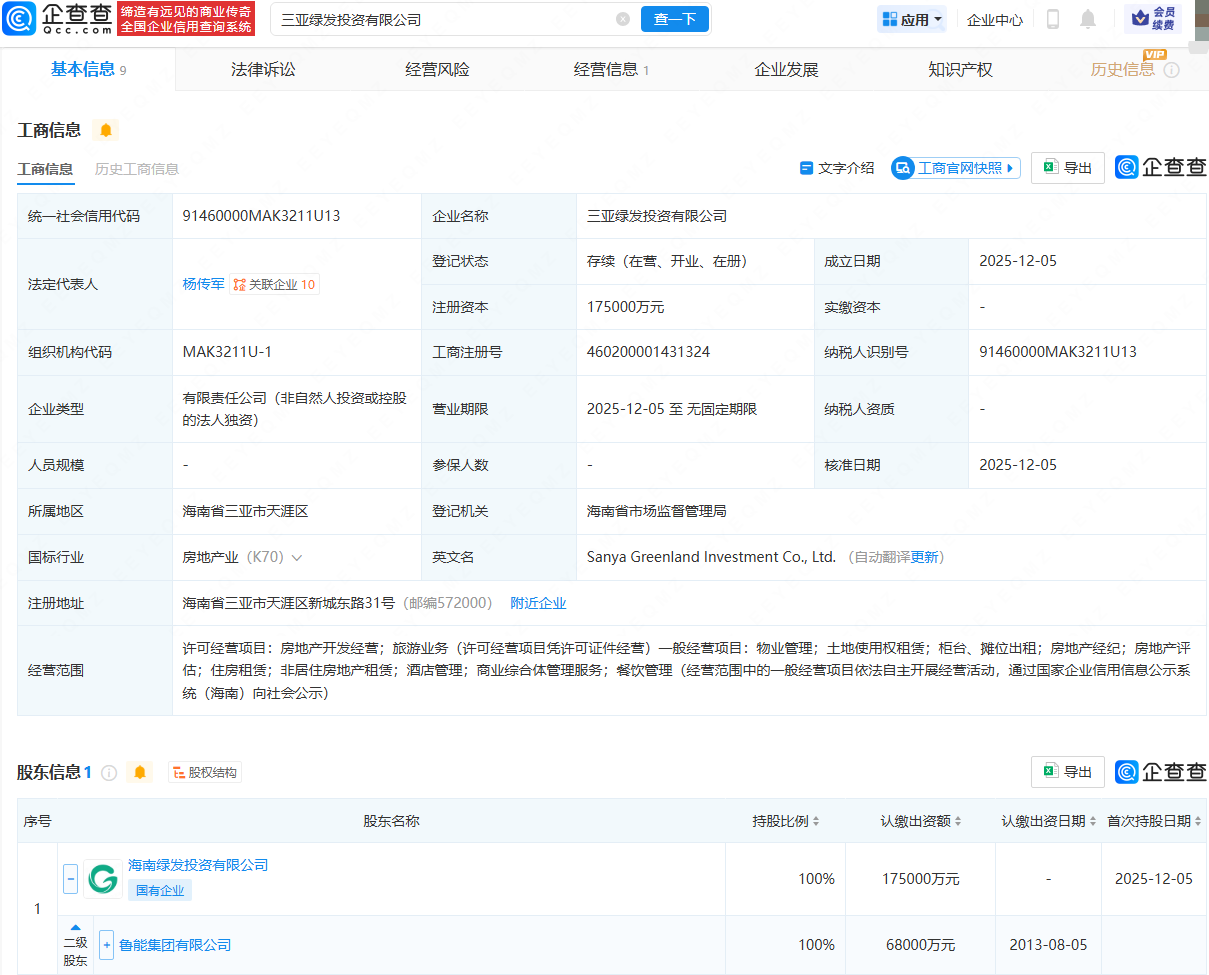 近日,三亚绿发投资有限公司成立,法定代表人为杨传军,注册资本为17.5亿元,经营范围包含:房地产开发经营;旅游业务;物业管理;土地使用权租赁;房地产经纪;商业综合体管理服务等。企查查股权穿透显示,该公司由鲁能集团旗下海南绿发投资有限公司全资持股。