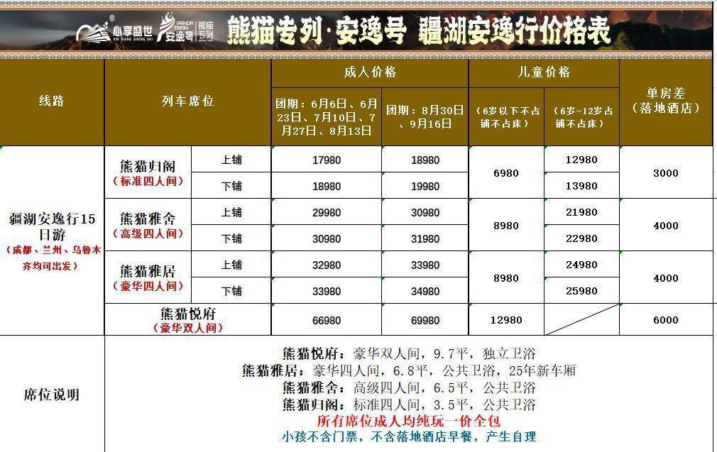 据了解,“熊猫专列·安逸号”是由中国铁路成都局集团有限公司运营的主题旅游列车,内外装饰均以熊猫为主题。该列车于2021年3月投入运营,并于2025年5月完成升级改造,座位数从252个增加至332个。成都某旅行社向记者介绍,今年“安逸号”推出15日全疆游线路,旅客可选从成都、兰州或乌鲁木齐上车。现有四种房型可供选择,分别为熊猫悦府、熊猫雅居、熊猫雅舍和熊猫归阁,价格因出发日期有所不同。例如,8月30日和9月16日出发的班次中,最低价为熊猫归阁上铺18980元/人,最高价为熊猫悦府69980元/人,6岁以下儿童不占铺位不占床位最低价为熊猫归阁6980元/人,费用含餐食、住宿、导游等服务,且最晚需提前3天结清所有费用。